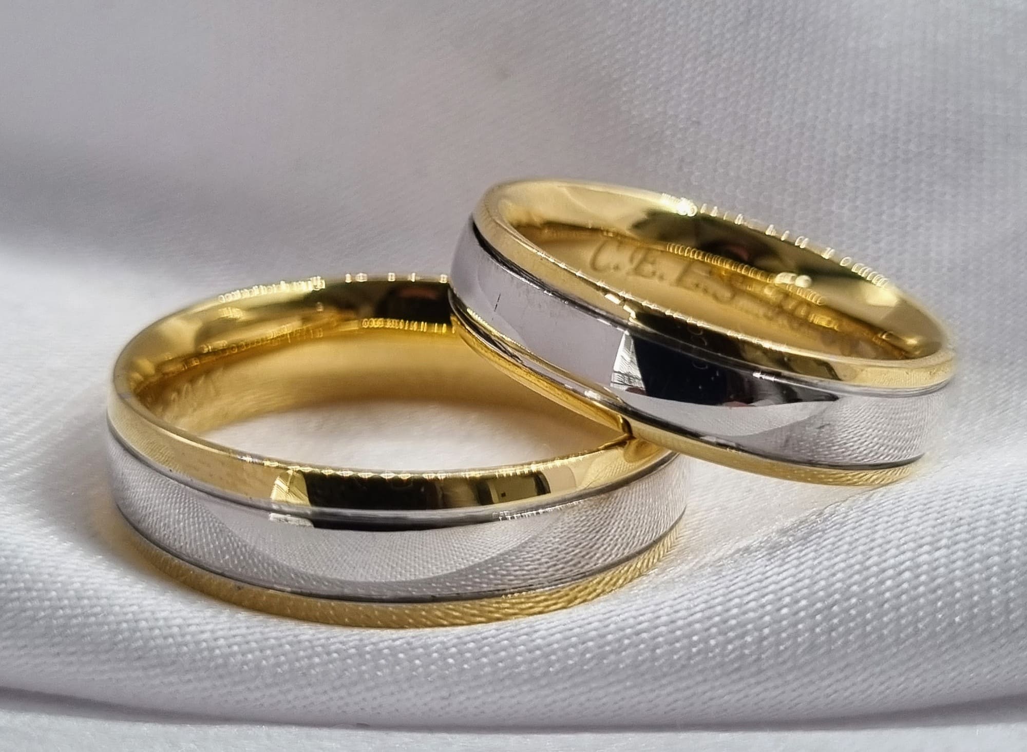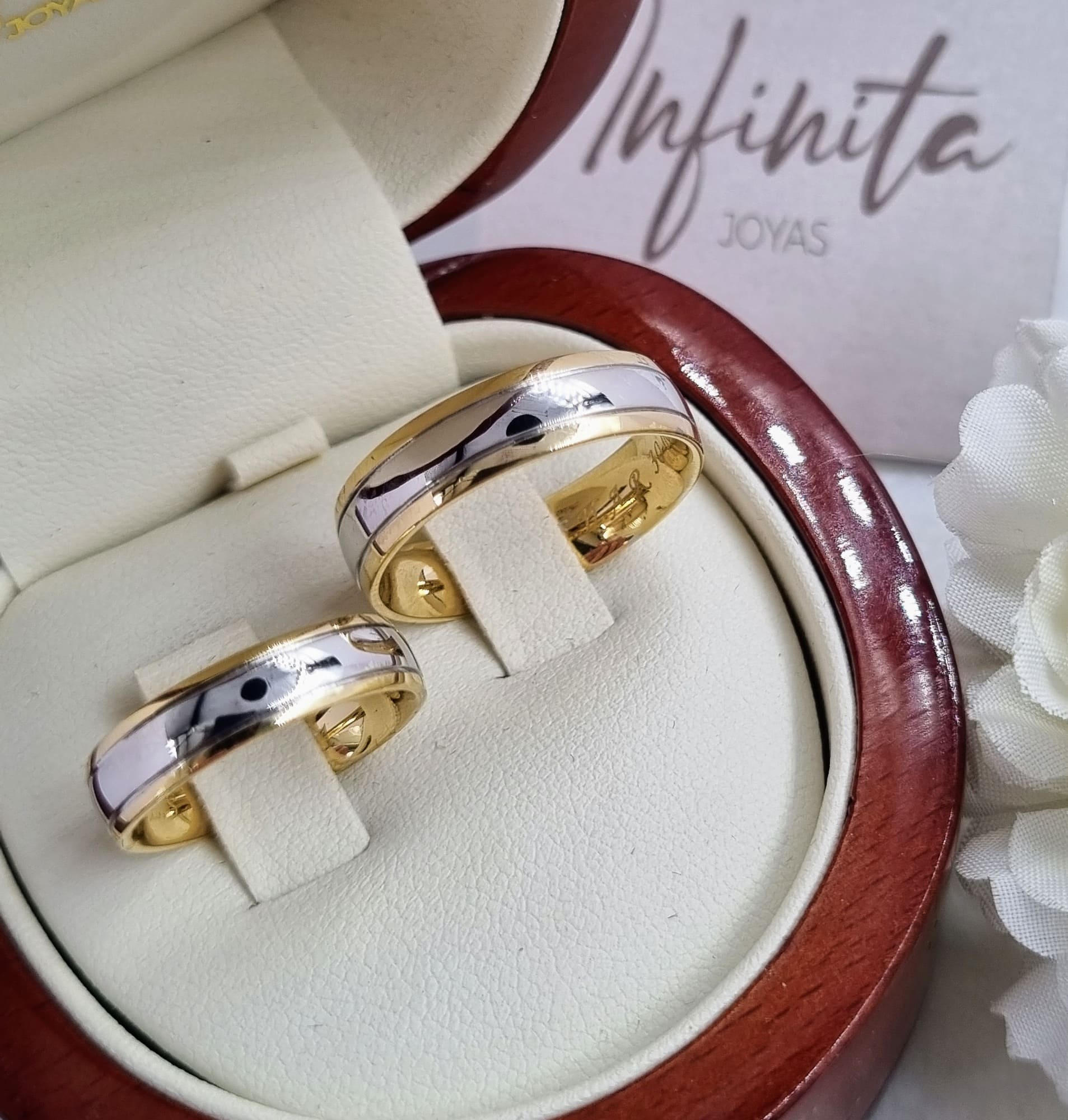 Argollas bicolor con base de oro amarillo y diseño central en oro blanco