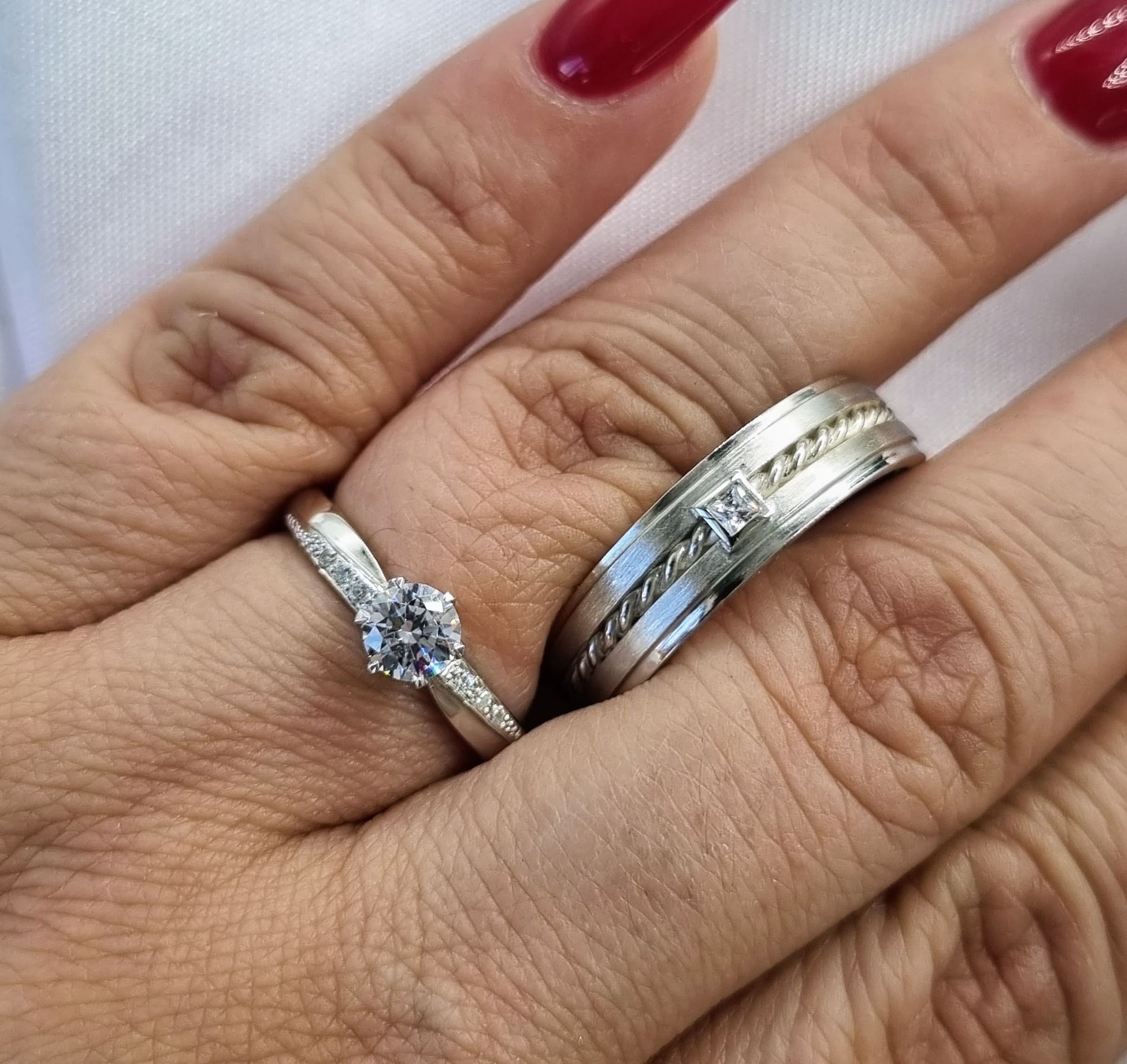 100% recomendable, rápida atención te acompañan en la decisión y el resultado vale la pena totalmente lo único que al ser un anillo más ancho me recomendaron una talla más y nos quedó grande a ambos. Pero lo arreglaron sin costo adicional.