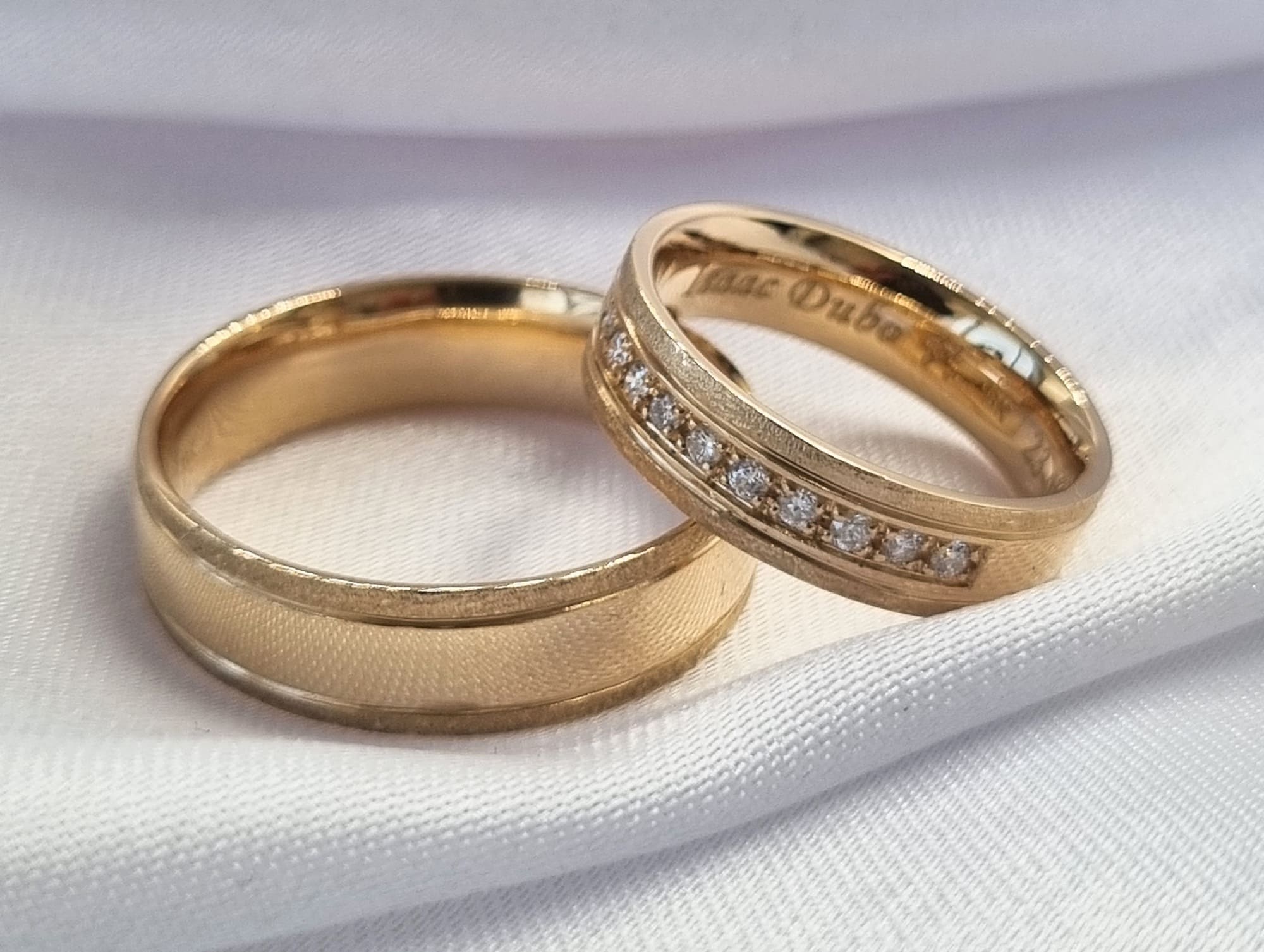 Argollas cinta sobrias y elegantes, con un delicado cintillo de brillantes en una de ellas.