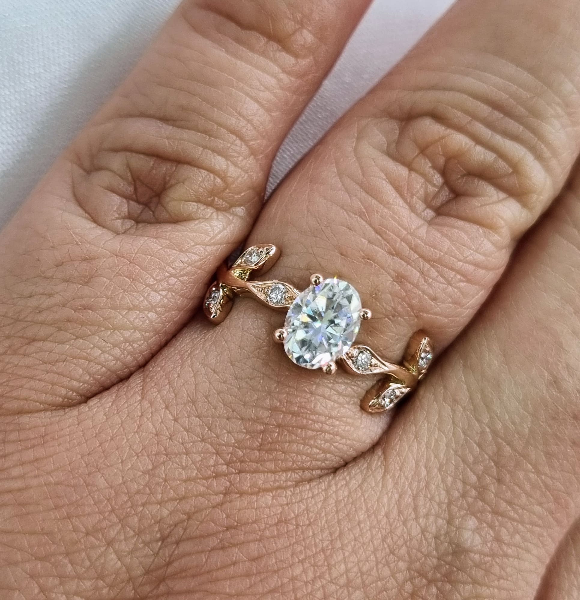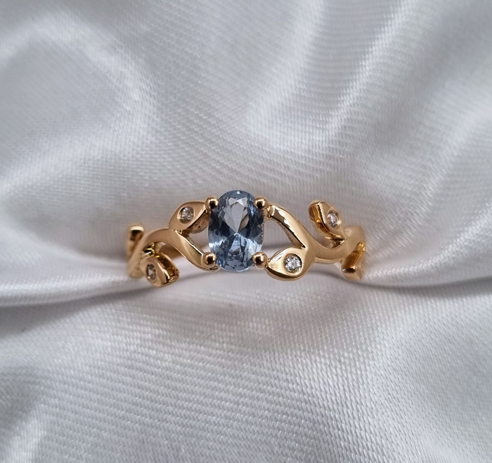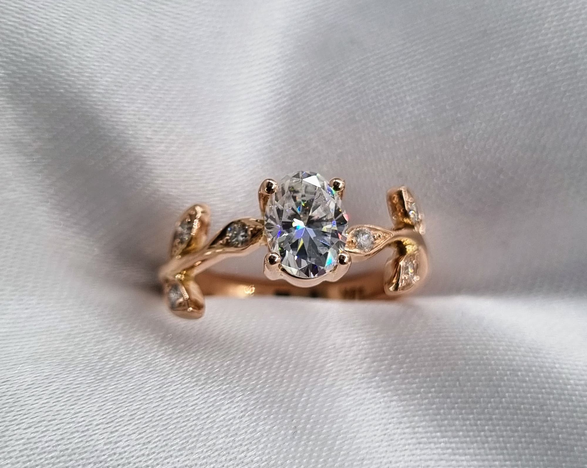 Delicadas hojas cuidadosamente fabricadas, acompañan a una gema central imponente y elegante