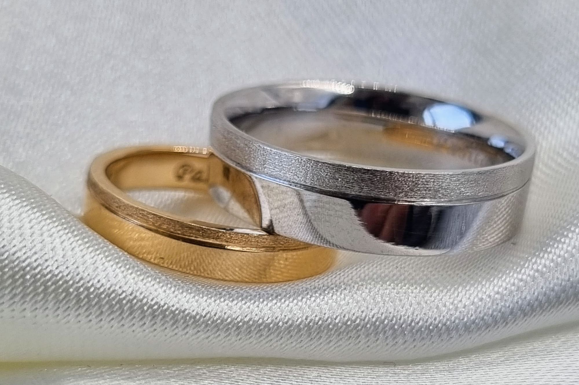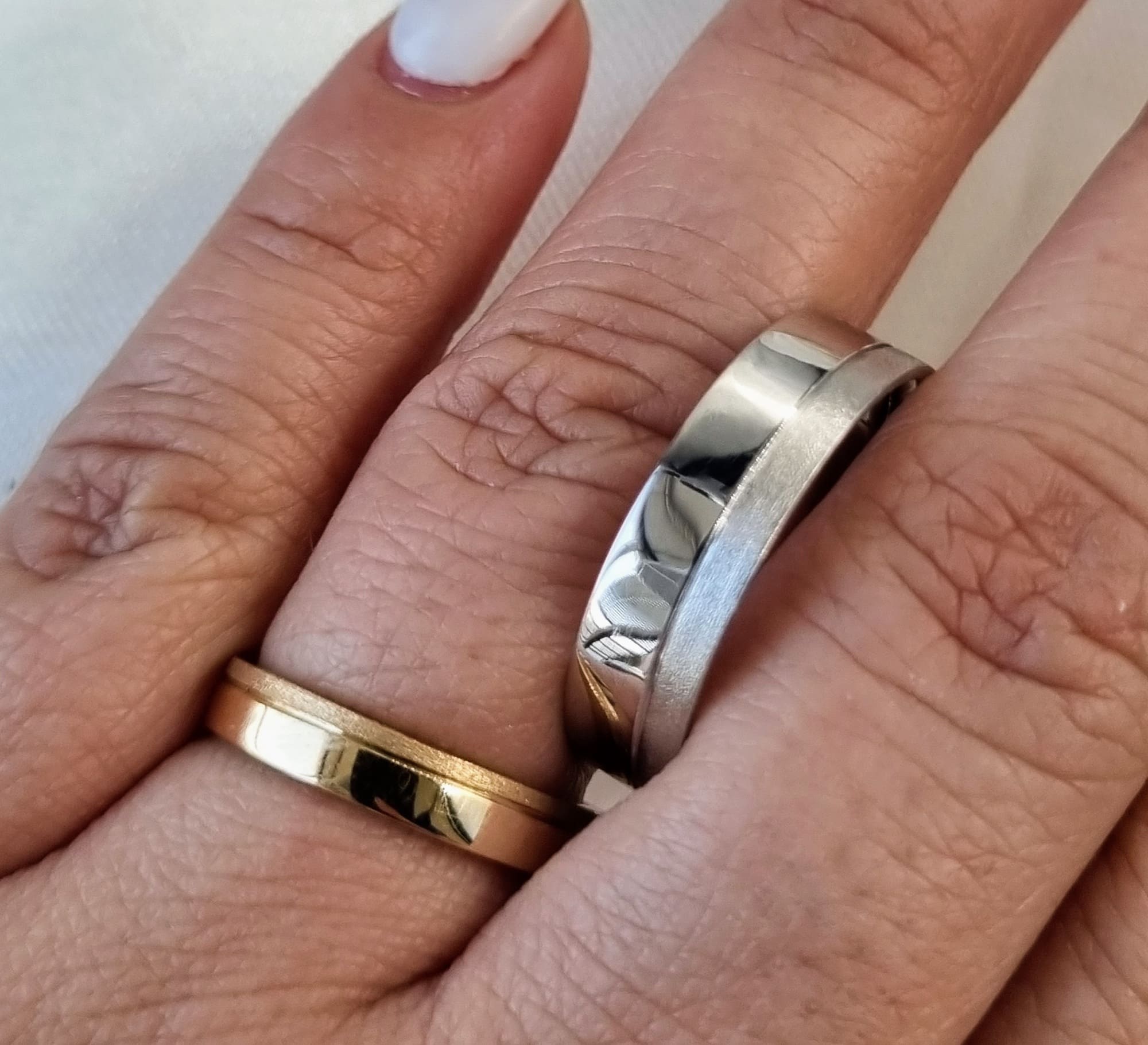 Argollas cinta en diferentes metales: plateado y tradicional, comparten el diseño satinado en borde