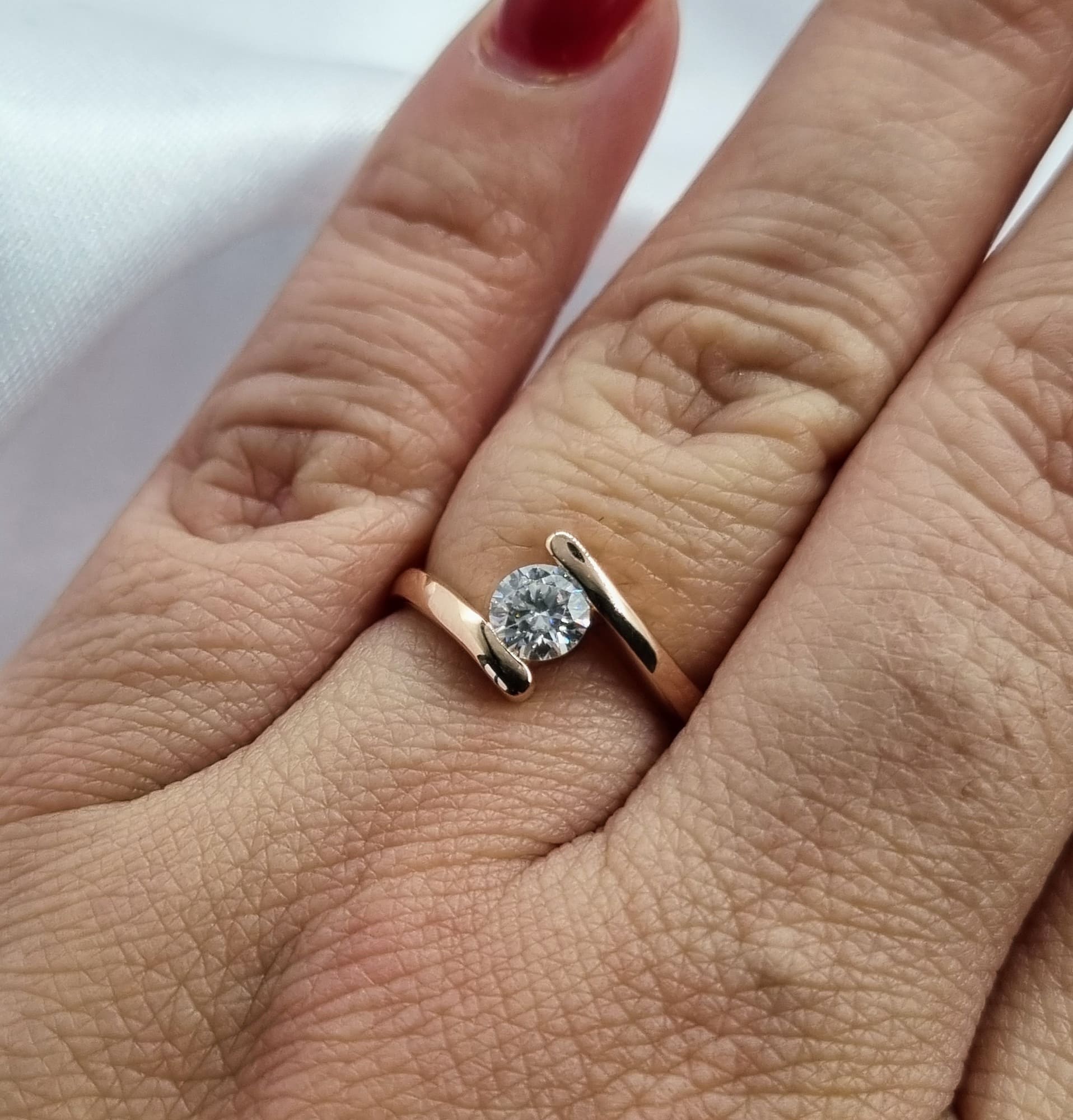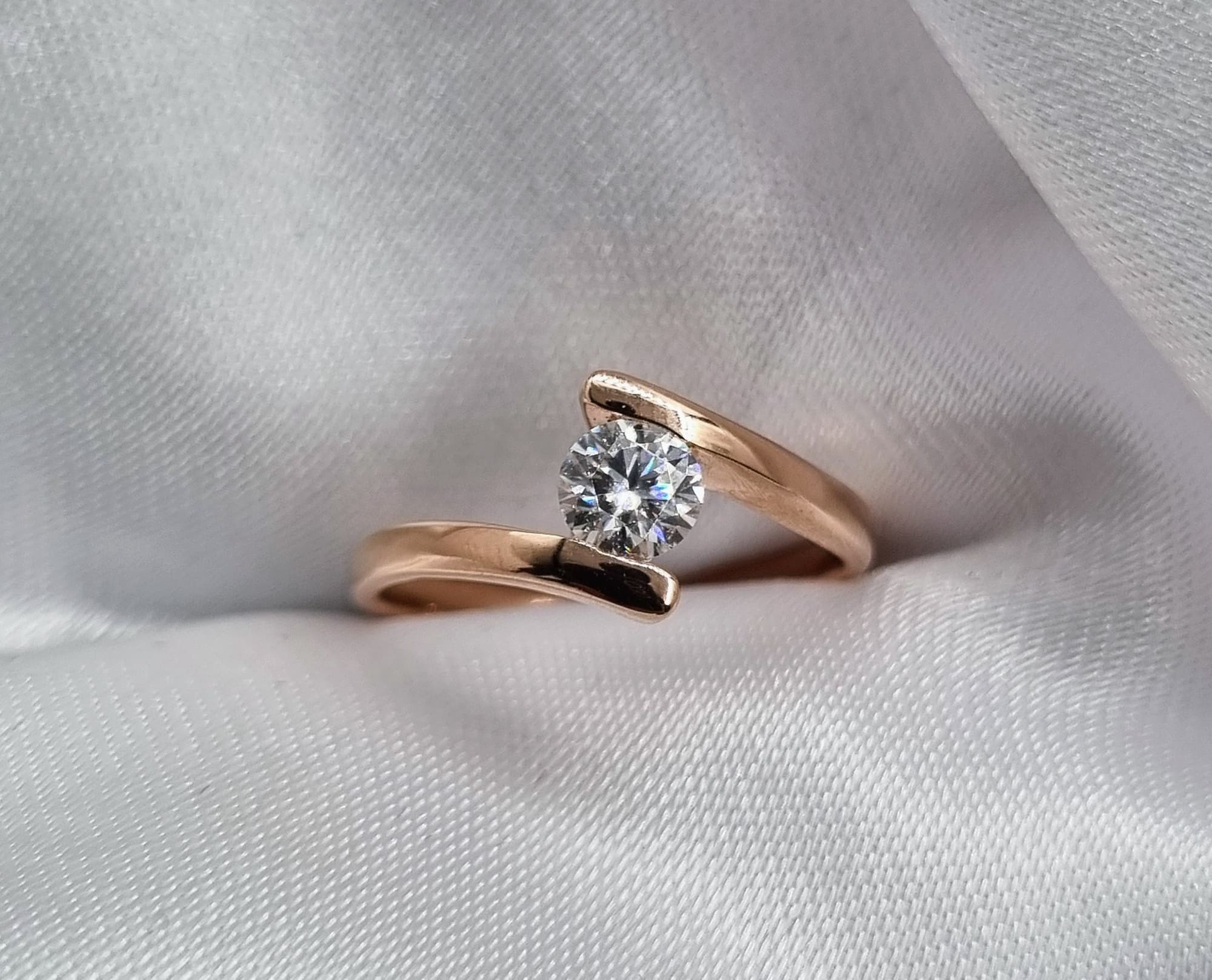 Dos líneas se unen en una gema corte brillante sostenida por los brazos de este delicado anillo